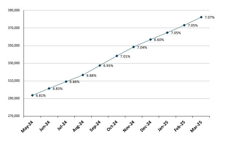 The graph shows the number of patients that have been flagged as potentially frail and have therefore been fast tracked to speak directly to a clinician who can provide personalised care; it shows the cumulative total (from the start of the project) and the percentage of potentially frail patients compared to the total number of matched patients (over the last 12 months).